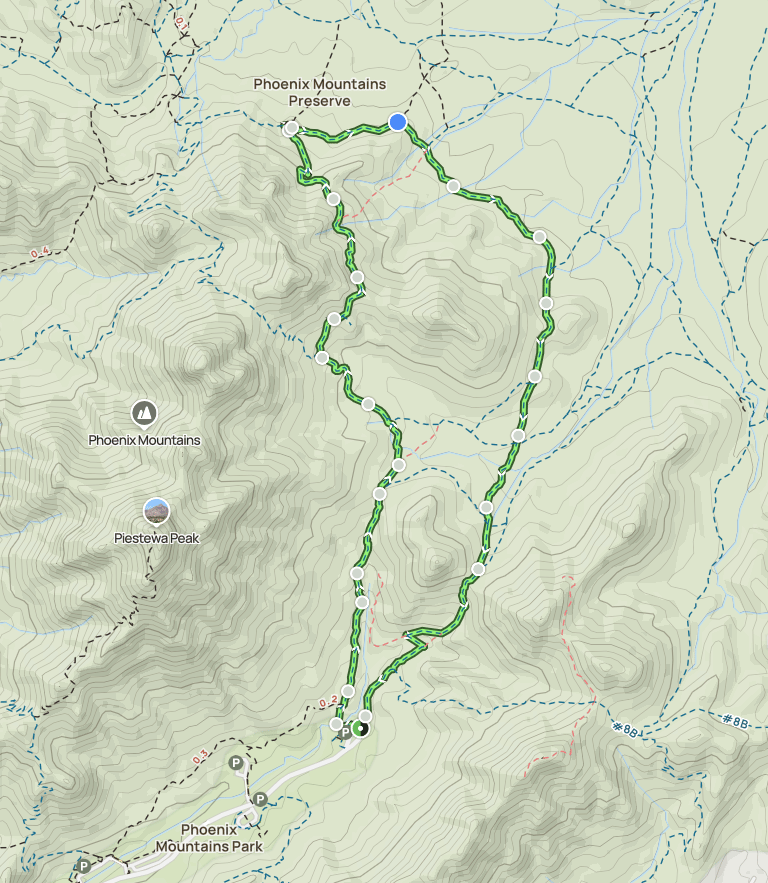 Loop which includes portions of several trails in the Phoenix Mountain Park (same park as Piestawa Peak trail). (click for All Trails info)